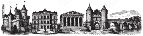 A detailed black and white illustration showcasing a diverse collection of architectural styles including a medieval castle, a Renaissance building, a Greek temple, and a stone bridge.