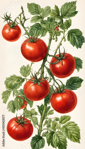 A detailed botanical illustration of a tomato plant featuring ripe red tomatoes and lush green leaves. The composition showcases the natural beauty and structure of the plant.