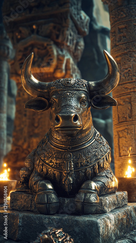 A detailed bronze bull statue with intricate carvings in an ancient temple setting, symbolizing power, prosperity, and strength in a mystical historical atmosphere