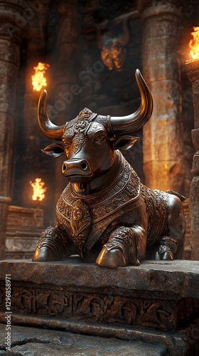 A detailed bronze bull statue with ornate carvings in an ancient temple setting, symbolizing strength, prosperity, and mysticism in a historical and sacred atmosphere