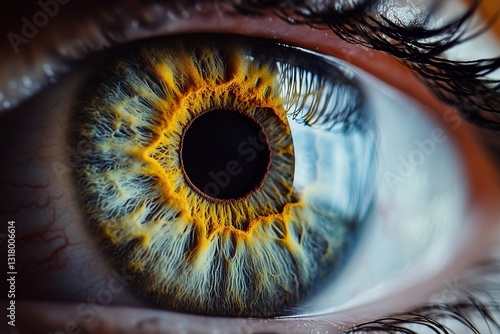 A detailed closeup of a human eye, showcasing the iris and pupil, with superimposed circular graphical elements symbolizing ophthalmology diagnostic technology, Full HD, 32k Resolution