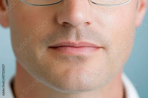 A detailed close-up of a man's face wearing glasses, showcasing his lips and smooth skin, emphasizing the subtleties of facial features and personal grooming.