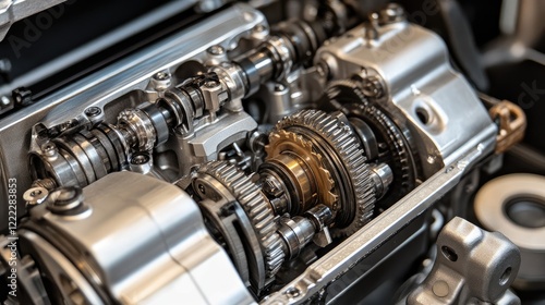 A detailed close-up of a mechanical assembly with interlocked gears and pistons.