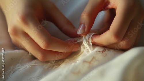 A detailed close-up of a person stitching a piece of fabric. This image can be used to represent craftsmanship, sewing, or DIY projects