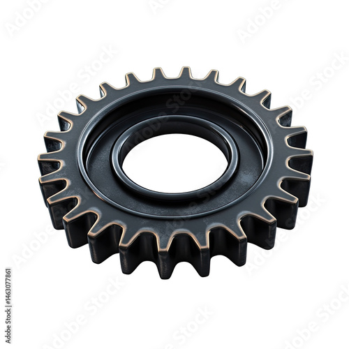 A detailed close-up of a single metal gear. It's dark gray with a slightly aged copper-like inner ring. The teeth are sharply defined