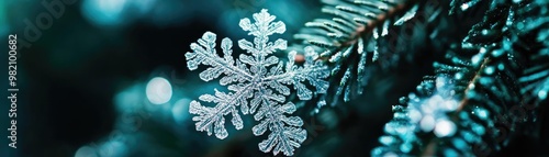 A detailed close-up of a snowflake resting on a pine branch, capturing the beauty of winter's delicate crystals and green foliage.
