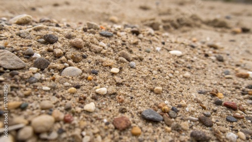A detailed closeup of sandy soil blending with small stones reveals the textural complexity of the mixture. The contrasting sizes of grains and pebbles emphasize the careful