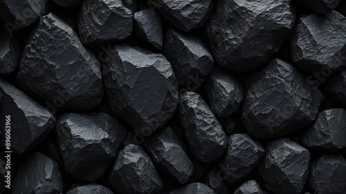 A detailed close-up photograph showcasing the rugged texture and dark tones of a collection of rough rocks. The high contrast between the dark stones and lighter.