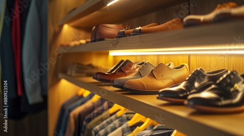 A detailed close-up view of a closet in a modern dressing room, featuring neatly arranged shoes and hanging clothes, soft lighting highlighting the organization and style