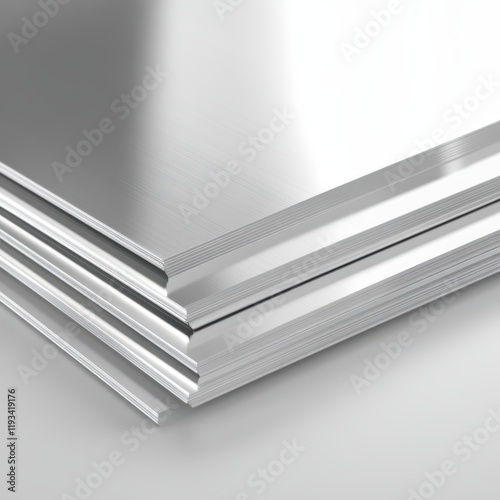 A detailed close-up view of a neatly arranged stack of metal sheets resting on a clean white surface, showcasing their texture and sheen.