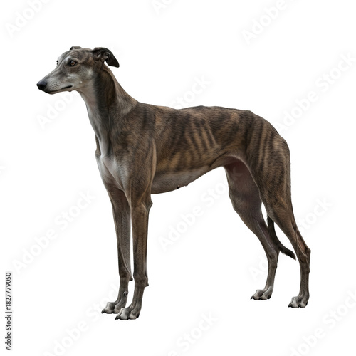 A detailed full-body shot of a sleek, graceful Greyhound dog breed in profile, showcasing its unique dog species characteristics against a clean white background, 20