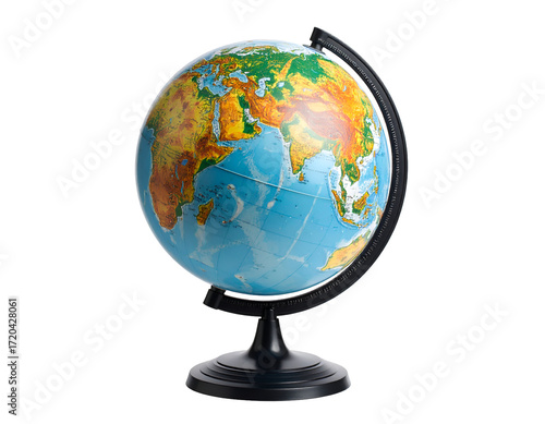 A detailed globe showcasing the continents, oceans, and geographical features in vibrant colors and textures.