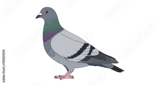A detailed illustration of a common pigeon standing in profile, showcasing its grey body, iridescent green and purple neck feathers, and red eye. isolated PNG with Transparent Background