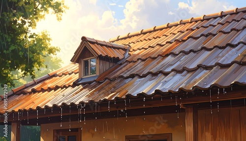 A detailed illustration of a rustic house roof after a rain shower, showcasing warm terracotta tiles glistening with water droplets, and a quaint attic window.