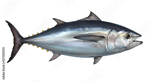 A detailed illustration of a tuna fish with a sleek, metallic body, yellow finlets, and a powerful tail.