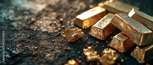 A detailed image of gold bars and nuggets on a textured background, symbolizing wealth, investment, and economic stability.