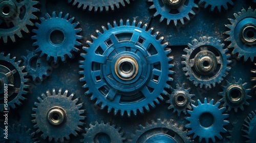 A detailed image showcasing a network of intricately designed blue gears. Represents complex systems and precision engineering.