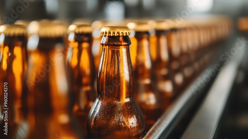 A detailed image showing multiple brown beer bottles neatly aligned on a conveyor belt, ready for processing or packaging in a brewery set up.