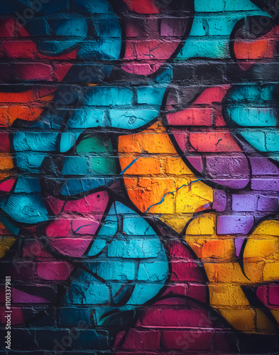 A detailed macro photograph of vibrant graffiti art on a textured brick wall, focusing on vivid colors and bold strokes in a creative composition.