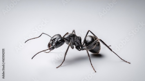 A detailed macro shot of a black ant standing on a gradient white surface