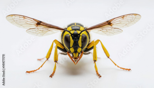 A detailed macro shot of a wasp with striking yellow and black patterns, showcasing its wings and intricate facial features.