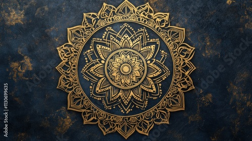 A detailed mandala illustration in gold on a dark blue background, with intricate geometric patterns.