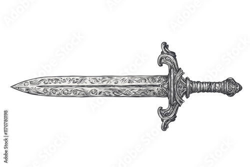 sword, ornate, blade, engraving, design, luxurious, powerful, treasure, legend, majestic, point, strong, knight, tradition, silver, fantasy, heritage, display, elegance, historical, warrior, guardian, fierce, mediaeval, striking, symbolism, weapon, artistry, classic, regal, intricacy, sharp, combat, adornment, craftsmanship, battle, armoring, handle, vintage, collection, art, style, metal, decorative, beauty, culture, ancient