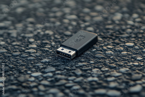 A detailed photo of an unmarked USB drive left on an office desk or parking lot pavement. Include clear desk or floor