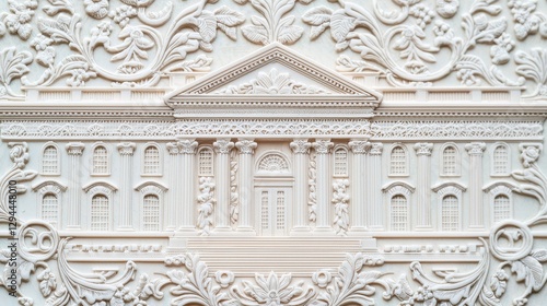 A detailed relief carving of a classic building, adorned with intricate floral patterns, showcasing artistry and architectural elegance.