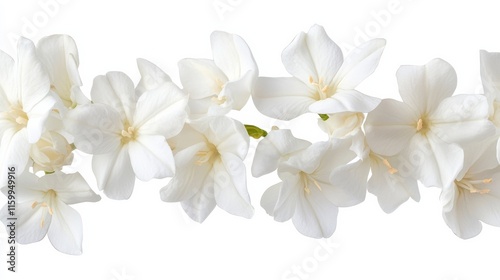 A detailed shot of delicate white jasmine flowers with their fragrant blossoms, isolated white background, minimalistic art style