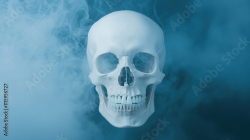 A detailed skull surrounded by a misty blue atmosphere.