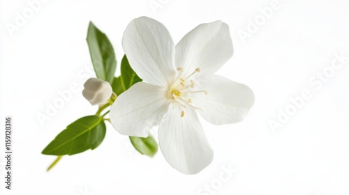 A detailed view of a delicate white jasmine flower with its tiny petals, isolated white background, minimalistic art style