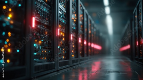 A detailed view of a futuristic server room bathed in the soft glow of data processing. ..Created with Generative AI, not depicting real subjects.