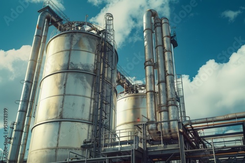 A detailed view of an industrial facility with shiny metallic tanks and complex pipe systems under a bright blue sky with scattered clouds.