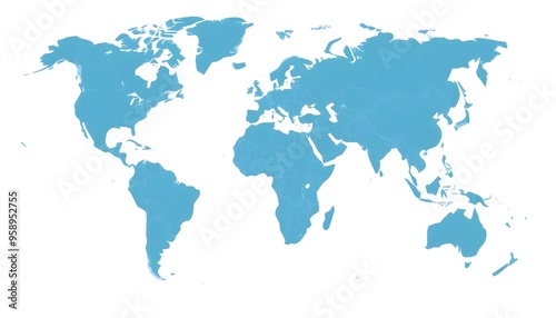 A detailed world map isolated on background and showing the continents and major landmasses in shades of blue