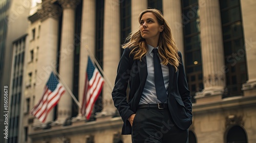 A determined young businesswoman walks through a historical financial district adorned with American flags, showcasing ambition and focus..