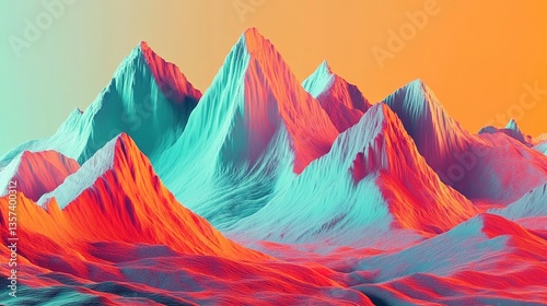 A digital art illustration of a vibrant mountain landscape with mountains in gradient shades of purple, pink, and blue, set against an orange sky, bright lighting