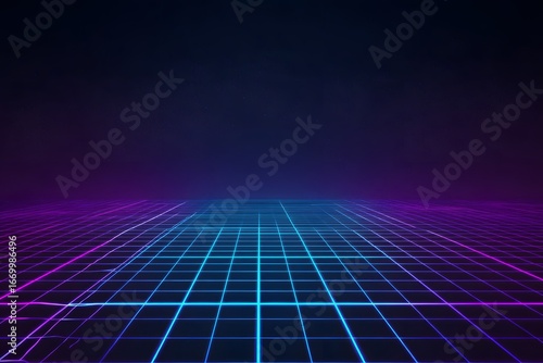 A digital grid background with neon blue and purple lines, creating an otherworldly atmosphere