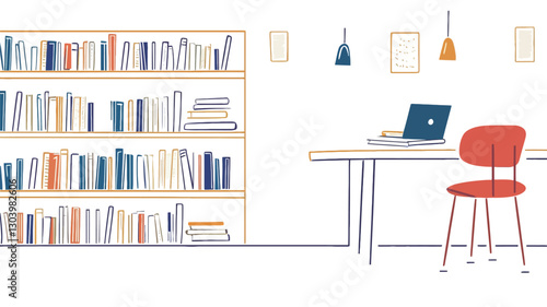 A digital illustration depicting a minimalist home office workspace. The illustration features a light-colored wooden bookshelf filled with various books, a simple desk with a laptop placed