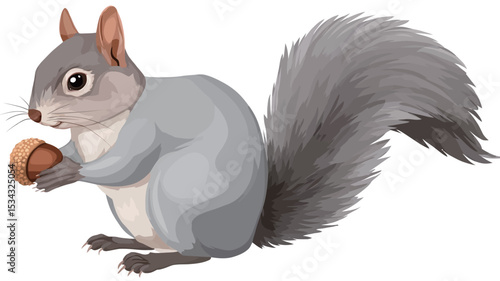 A digital illustration of a grey squirrel sitting on a white background. The squirrel is depicted in a cartoonish style with soft, muted grey fur. It holds an acorn in its paws. The illustration