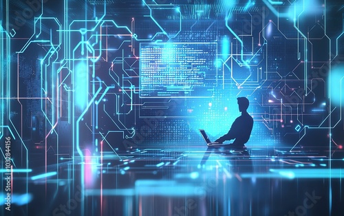 A digital landscape featuring a silhouette of a person working on a laptop surrounded by glowing circuit patterns and data streams