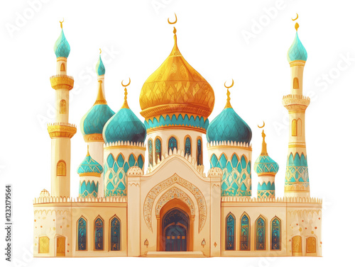 A digital painting depicts a large ornate mosque with teal and gold domes, minarets, and intricate details.