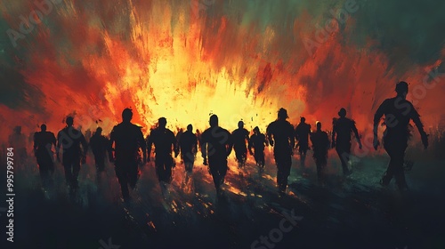 A digital painting of a community march, participants wearing black shirts, their silhouettes forming a powerful wave of solidarity. Digital Painting, Dark Tones, High Contrast, Dynamic Composition