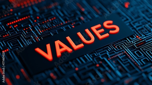 A digital representation showcasing the word "VALUES" illuminated against a backdrop of intricate circuitry, emphasizing technology and principles.