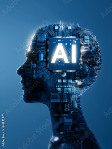 A digital silhouette of a human head filled with circuit patterns, highlighting the concept of artificial intelligence (AI) with a prominent "AI" symbol.
