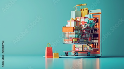 a digital storefront where a cart overflows with packages, perched atop a laptop, illustrating the seamless shopping experience enabled by technology