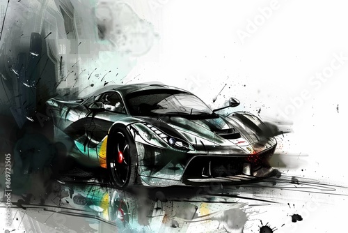 A digital watercolor artwork showcasing a sleek concept car in black and green, speeding across a white canvas. Smoke swirls from the wheels, and dynamic lines emphasize the car's high-velocity moving