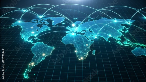 a digital world map with a glowing network overlay, representing global communication, international business connectivity, and modern technology in a digital age