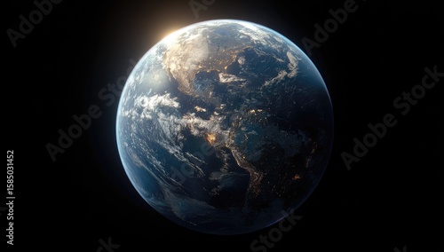 A digitally rendered Earth, illuminated by a sunbeam from the left, showcasing swirling clouds, landmasses, and city lights at night against a pitch-black backdrop