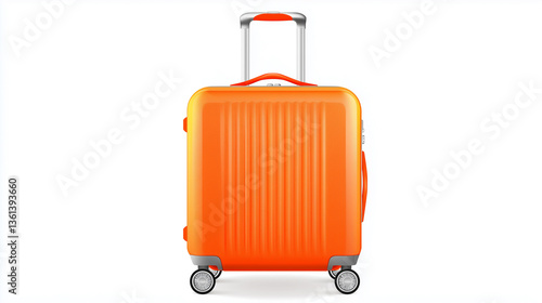 A digitally rendered image showcases a bright orange, hard-shell suitcase with a retractable handle and four inline wheels. The suitcase is presented against a plain white background, eliminating any